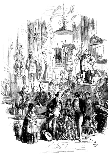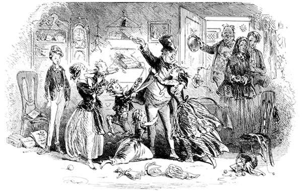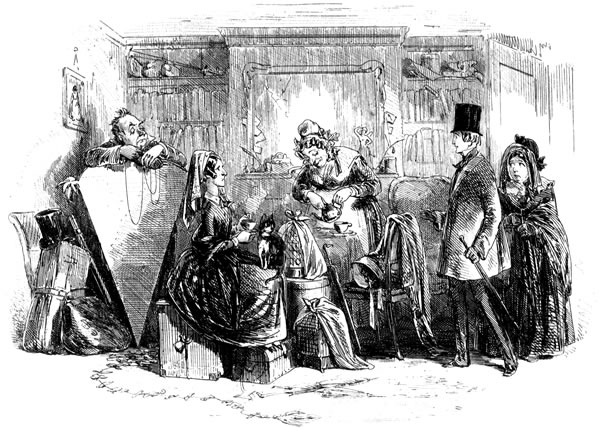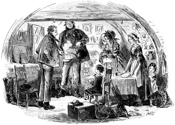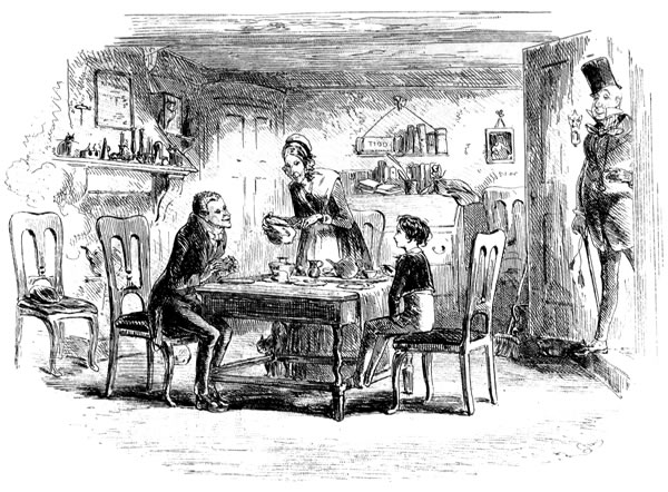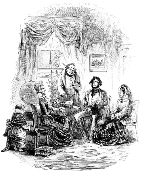 Traddles’s house is one of the very houses—or it easily may have been—which he and Sophy used to parcel out, in their evening walks. It is a large house; but Traddles keeps his papers in his dressing-room, and his boots with his papers; and he and Sophy squeeze themselves into upper rooms, reserving the best bed-rooms for the Beauty and the girls. There is no room to spare in the house; for more of “the girls” are here, and always are here, by some accident or other, than I know how to count. Here, when we go in, is a crowd of them, running down to the door, and handing Traddles about to be kissed, until he is out of breath. Here, established in perpetuity, is the poor Beauty, a widow with a little girl; here, at dinner on Sophy’s birthday, are the three married girls with their three husbands, and one of the husband’s brothers, and another husband’s cousin, and another husband’s sister, who appears to me to be engaged to the cousin. Traddles, exactly the same simple, unaffected fellow as he ever was, sits at the foot of the large table like a Patriarch; and Sophy beams upon him, from the head, across a cheerful space that is certainly not glittering with Britannia metal.