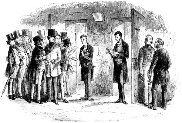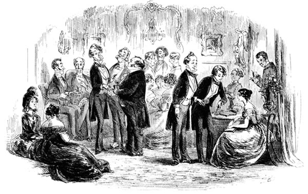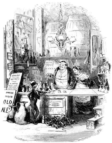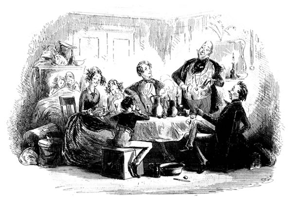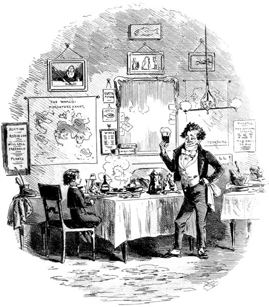 “☞ The public dinner to our distinguished fellow-colonist and townsman, Wilkins Micawber, Esquire, Port Middlebay District Magistrate, came off yesterday in the large room of the Hotel, which was crowded to suffocation. It is estimated that not fewer than forty-seven persons must have been accommodated with dinner at one time, exclusive of the company in the passage and on the stairs. The beauty, fashion, and exclusiveness of Port Middlebay, flocked to do honor to one so deservedly esteemed, so highly talented, and so widely popular. Doctor Mell (of Colonial Salem-House Grammar School, Port Middlebay) presided, and on his right sat the distinguished guest. After the removal of the cloth, and the singing of Non Nobis (beautifully executed, and in which we were at no loss to distinguish the bell-like notes of that gifted amateur, Wilkins Micawber, Esquire, Junior), the usual loyal and patriotic toasts were severally given and rapturously received. Doctor Mell, in a speech replete with feeling, then proposed ‘Our distinguished Guest, the ornament of our town. May he never leave us but to better himself, and may his success among us be such as to render his bettering himself impossible!’ The cheering with which the toast was received defies description. Again and again it rose and fell, like the waves of ocean. At length all was hushed, and Wilkins Micawber, Esquire, presented himself to return thanks. Far be it from us, in the present comparatively imperfect state of the resources of our establishment, to endeavour to follow our distinguished townsman through the smoothly-flowing periods of his polished and highly-ornate address! Suffice it to observe, that it was a masterpiece of eloquence; and that those passages in which he more particularly traced his own successful career to its source, and warned the younger portion of his auditory from the shoals of ever incurring pecuniary liabilities which they were unable to liquidate, brought a tear into the manliest eye present. The remaining toasts were Doctor Mell; Mrs. Micawber (who gracefully bowed her acknowledgments from the side-door, where a galaxy of beauty was elevated on chairs, at once to witness and adorn the gratifying scene); Mrs. Ridger Begs (late Miss Micawber); Mrs. Mell; Wilkins Micawber, Esquire, Junior (who convulsed the assembly by humorously remarking that he found himself unable to return thanks in a speech, but would do so, with their permission, in a song); Mrs. Micawber’s Family (well-known, it is needless to remark, in the mother-country), &c. &c. &c. At the conclusion of the proceedings the tables were cleared as if by art-magic for dancing. Among the votaries of Terpsichore, who disported themselves until Sol gave warning for departure, Wilkins Micawber, Esquire, Junior, and the lovely and accomplished Miss Helena, fourth daughter of Doctor Mell, were particularly remarkable.”