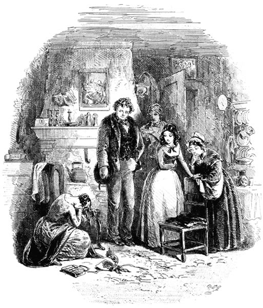 “Some thinks,” he said, “as her affection was ill-bestowed; some, as her marriage was broke off by death. No one knows how ’tis. She might have married well, a mort of times, ‘but, uncle,’ she says to me, ‘that’s gone for ever.’ Cheerful along with me; retired when others is by; fond of going any distance fur to teach a child, or fur to tend a sick person, or fur to do some kindness tow’rds a young girl’s wedding (and she’s done a many, but has never seen one); fondly loving of her uncle; patient; liked by young and old; sowt out by all that has any trouble. That’s Em’ly!”