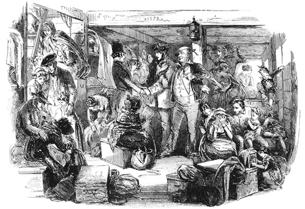 “I kep it from her arter I heerd on’t,” said Mr. Peggotty, “going on nigh a year. We was living then in a solitary place, but among the beautifullest trees, and with the roses a covering our Beein to the roof. Theer come along one day, when I was out a working on the land, a traveller from our own Norfolk or Suffolk in England (I doen’t rightly mind which), and of course we took him in, and giv him to eat and drink, and made him welcome. We all do that, all the colony over. He’d got an old newspaper with him, and some other account in print of the storm. That’s how she know’d it. When I come home at night, I found she know’d it.”