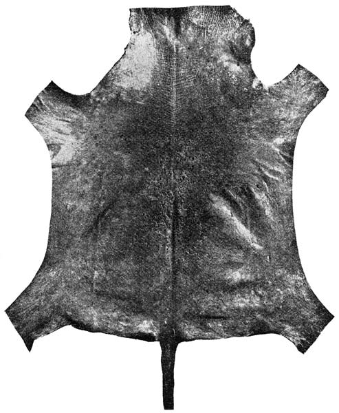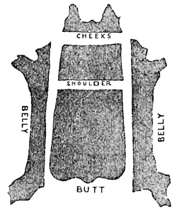 In tanning hides for belting, the shoulders and bellies are cut off and usually dressed for sole or harness leather, leaving the butt, the prime part of the hide, 4-1/2 ft. in length (Fig. 23). The tanned butt is first shaved to level the substance, then washed in a solution 135 of borax, and sumached in the drum. After smoothing the leather in the striking-out machine, it is partially dried ("sammed") and then rubbed on both sides with a dubbin of cod oil and tallow. In this condition the butts are left piled up for a few days, so that the dubbin penetrates the leather, which is then extended with the sleeker (Fig. 32) to make it smooth and to remove surplus grease, which is sold to soap-makers under the currier's name of "moisings." The leather is finally dried, rolled (optional), stretched by machine, and cut up in the width of belting required. Instead of "hand-stuffing" the leather with cod oil and tallow, which is still the best method, a large quantity of butts are now "drum-stuffed," the object being to make use of stearines, which are harder and heavier greases than 136 tallow. The type of drum shown in Figure 35, in which the grease is incorporated with the leather by means of live steam, gives satisfactory results, although hot air apparatus is now replacing the steam injector.