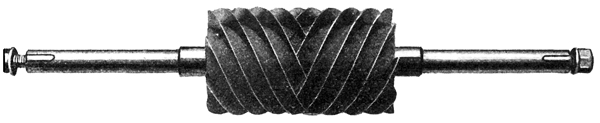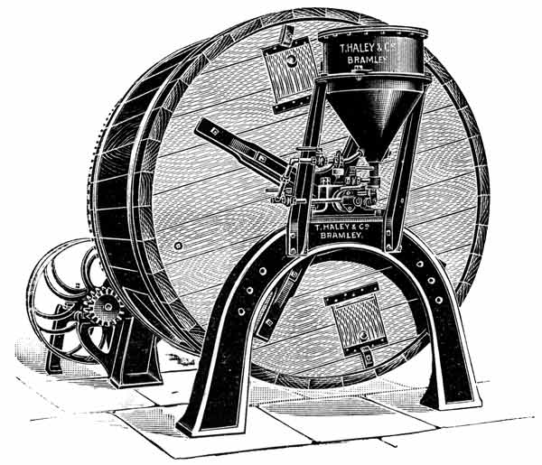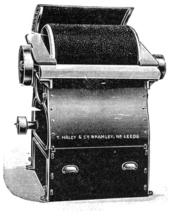 When the leather is completely dried, it may be sold at once, but if, as is generally the case, a special "nap" finish is required on the flesh side, the hides are placed in damped deal sawdust until they are in the right condition of flexibility for the next process, known as "fluffing." This is done on a rapidly revolving wheel (Fig. 33) covered with emery powder varying in the size of grain according to the effect desired on the finished leather. The abrasion of the leather on the flesh (i.e., the under side) raises a soft nap. Carborundum, a special abrasive made in America, by the fusion of sand, coke, and salt at a very high temperature, has to some extent supplanted the use of emery. As a 129 final finish, the flesh side may be rubbed over with chalk or china clay to give it a clear saleable appearance.