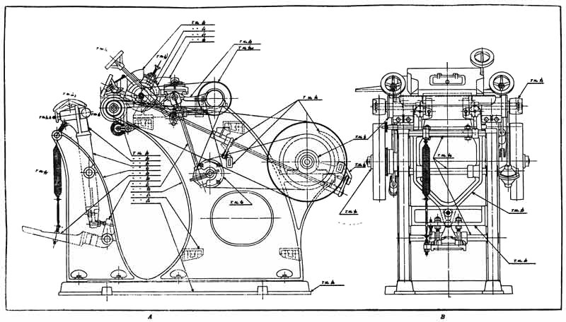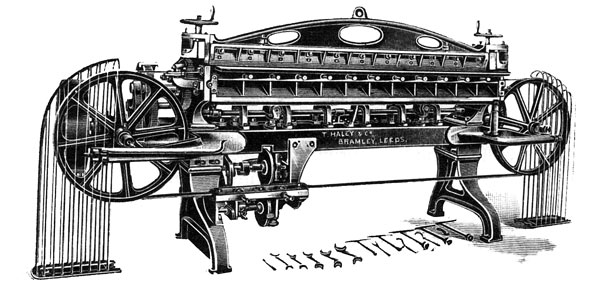 A quick and effective method of deliming is to treat the skins in a weak solution of lactic acid. Some dressers use a drench of pea-flour or bran. The mild acids produced by the fermentation of these materials not only neutralise the lime but also reduce the gristly nature of the skins to a soft, supple condition. The bran infusion is slightly warmed to hasten the process of fermentation, but the temperature must not exceed 100° F. (32° C.). The linings are then rinsed in cold water and sent to the stocking machines, in which they are kneaded until they become quite soft. Either the faller-stocks or the mechanical pushers (Fig. 14) may be used, the latter being the more modern machine. The operation may require from four to ten hours, the completion being determined by the condition of the skins. "Samming" follows stocking, and for this purpose the linings are hung up in the drying shed until thoroughly dripped, but not dried. In this slightly damp condition they are then prepared for the next process of oiling, which is the most important part of chamois-dressing, as it converts the perishable raw linings into leather. In the United Kingdom, cod oil (generally Newfoundland) is used exclusively, and gives best results. Whale and shark liver, or menhaden oils are often used abroad.
