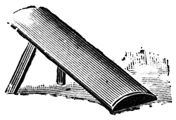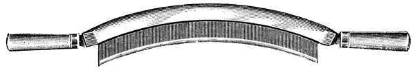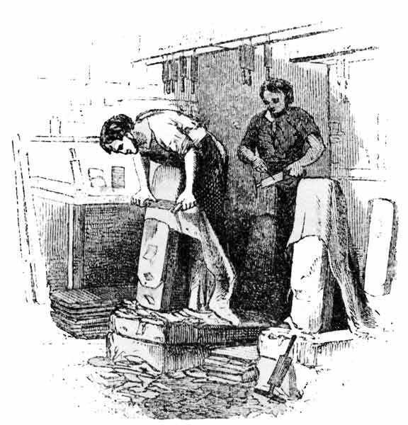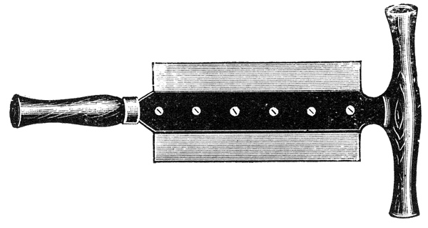 If done by hand, the skins are placed on a sloping glass or slate table, with the flesh side uppermost, which is then stretched out by strong pressure with a tool known as a sleeker, the strokes being made downward in the direction of the hair growth. The flesh side done, the whole skin is turned over and the grain side is similarly treated. Sometimes only the flesh side is struck out, especially if the grain is soft and tender. The sleeker consists of an iron, steel, or copper blade, about 6 in. square, fitted in a wood handle (Fig. 32). The skins are hung up in the drying-room immediately 142 they are extended and smoothed by sleeking, and are then either allowed to dry completely, or, as is generally the case with best leather, they are hung up until a great deal of the moisture is evaporated and the skins are left in a slightly moist, or, as it is generally termed, "sammed" condition. The skins are then taken down, damped in dry parts, folded over, laid in piles to equalise the moisture, and finally smoothed out and stretched again by hand or machine. This second operation after the dyeing is known as "setting."