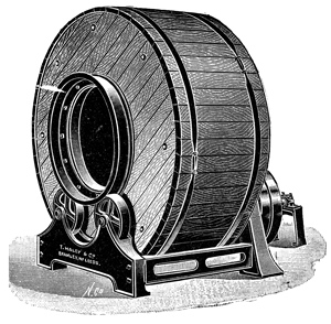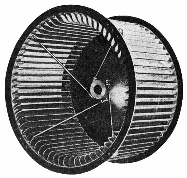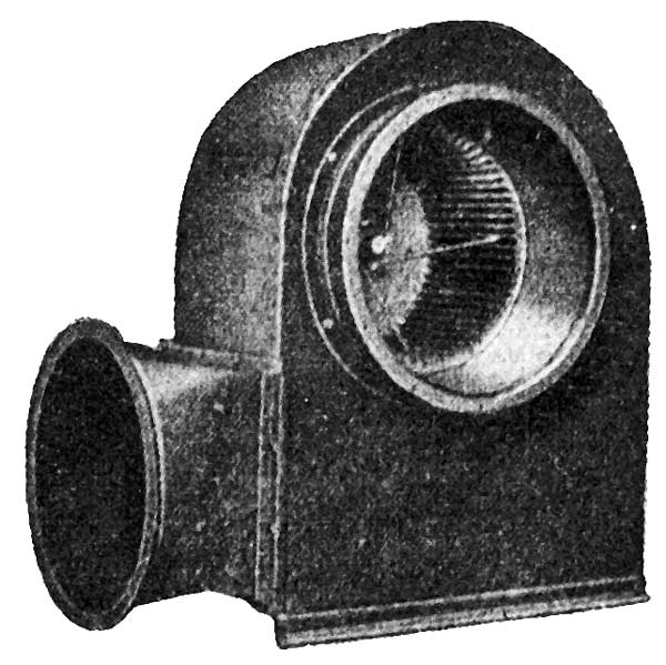 The Howard-Smith plant consists of a series of steel tubes into which hot water or steam is pumped. These pipes are enclosed in a chamber in which the air naturally 125 acquires great heat. A fan (Fig. 29) is fixed in one side of this chamber (Fig. 30) and, when in motion, drives the hot air through a wide tube which leads to the drying chamber.