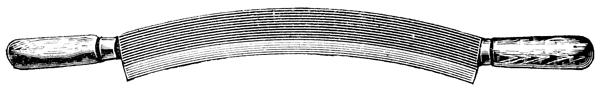 The natural chrome sole requires very little dressing. The chromed hides (usually rounded into butts or bends, shoulders and bellies) are allowed to remain on a horse two or three days after the completion of the tannage, so that the oxide of chromium may combine more firmly with the fibres. They are then placed in the drum tumbler again and washed in cold water for several hours. A constant stream is conveyed to the drum through a rubber pipe fixed to the tap, and escapes through small holes in the drum. The acid salts are not thoroughly removed by this washing and must, therefore, be neutralised with an alkali. Borax is the best for the purpose, owing to its mild action on leather and antiseptic properties. From 1 to 2 per cent. borax on the weight of the leather is generally sufficient, while, if soda be used for economical reasons, only half the quantity is required. The drum is revolved for about an hour; the liquor is then run off, and the leather receives a further washing in cold water for half an hour, when it is in a condition to receive the dressing, which is chiefly composed of materials which help to fill and lubricate the interstices of the fibres so that the substance is maintained and the natural strength of the fibres preserved. Gelatine, pure glue, Tragasol, paraffin wax, carnauba wax, spermaceti, Marseilles soap, are among the various ingredients used; while the delicacy of the tint may be improved with china clay or French chalk. Recipes vary considerably, each manufacturer claiming to have secret methods. Solutions are made of the ingredients, or, where one or more of the materials are insoluble, they are atomised in a mixing pan before use. To induce thorough penetration, the dressing liquid may be 128 applied to the leather at a fairly high temperature, as chrome leather is unaffected by heat which would destroy the fibres of ordinary vegetable-tanned leather. Even so, it is inadvisable to use a higher temperature than 170° F. The leather is thoroughly impregnated with the dressing in about an hour's time, and is then piled on a wooden horse for several hours, or overnight, to drain and permit thorough incorporation of the dressing with the leather. When well-drained, the grain of the hides is smoothed by pressure with a special tool (Fig. 32) or by machine, the operation being known technically as "striking out." The machine (Fig. 34) gives quite satisfactory results and has replaced hand labour in all modern works. The hides are then "strained" (i.e., extended and nailed to wooden frames), or they are simply hung up to dry. In the latter case, there is a small shrinkage of the size of the hide, but the substance is maintained. With good straining, a satisfactory increase of surface measurement can be obtained.