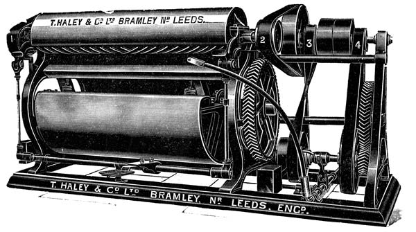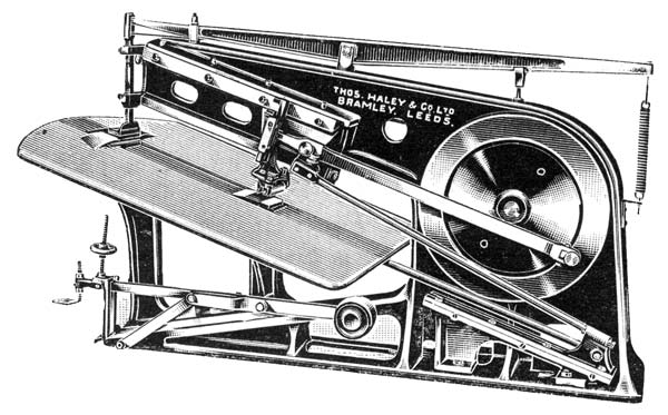 The thoroughly softened leather is then dried, mordanted with a solution of logwood, or haematin crystals, blacked with levant ink, a specially prepared black dye, or with a suitable aniline dye, and dried again. It is finally seasoned with a glutinous or albuminous mixture (blood albumen, milk, and a little aniline black 144 dye make a good mixture), dried, glazed, seasoned a second time, and reglazed. A light coating of mineral oil turns the finish into a jet black, and the leather is ready for the warehouse. There are several types of glazing machines, but the "grasshopper" (so called owing to its action) is the most popular for box calf. This machine is the same as shown in Figure 36, except that the working tool is replaced with a smooth glass or agate roller.