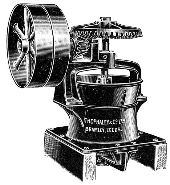 In most of the English tanneries a decoction of dog manure is used, at a temperature not exceeding 90° F., but on the Continent the artificial puer, oropon, is preferred. It is much safer to use and more uniform in its action than excrement, which develops bacteria rapidly in contact with gelatinous pelts, and could ultimately destroy them entirely. After puering them, the pelts are well washed and submitted to the process of drenching, which consists in putting the skins into a warm infusion of bran or pea-flour and leaving them covered until the following morning. The slightly acid fermentation causes the pelts to rise to the top of the vat. They are pushed into the liquor again with a pole and stirred round. This is repeated three or four times to prevent damage to the grain. The process is often done in the paddle-vat (Fig. 25), in which the bran liquor is circulated for several hours before the pelts are allowed to remain quiescent. Drenching thoroughly purges the pelts of the last traces of lime, and puts them in suitable condition for being made into leather. The pelts are then rinsed in tepid water and "scudded" on the grain with a slate or vulcanite tool, shaped somewhat like a dehairing knife. The scud removed consists of dirt, dissolved lime salts, short hairs, and pigment. Machines are rapidly replacing manual labour for this operation.
