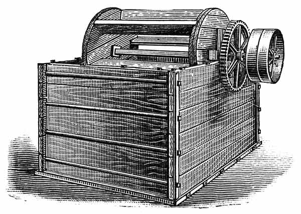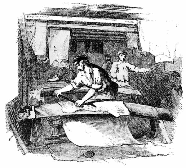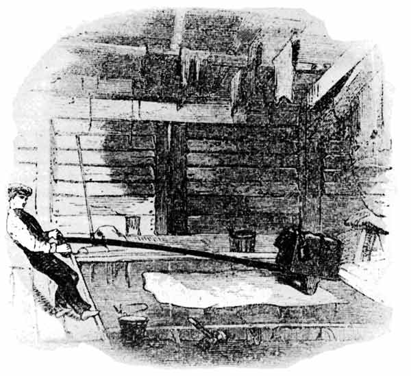 Instead of the rolling machine, some French tanners use the hammering machine, which gives good results, but is necessarily slow and frightfully noisy in action. The steel hammer moves up and down with remarkable rapidity, but only a small area is covered by each blow.