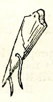 When they retired I went too, and saw how the bird was built, and this was the way they did it. First of all they procured a sheet of stiff brown paper, which they rolled into a cornucopia; then with a paper spill dipped in ink they marked on it a saw-like line to represent the mouth. Then they made a hole in the mouth, and passed through it a piece of picture cord; this was supposed to represent a worm or a snake (see Fig. 1). Then they fastened this cornucopia on the face of the boy cousin, as represented in Fig. 2. Then they procured a pair of yellow slippers, on which they pinned some slips of brown paper; these they put on the feet of the boy. Then they twisted a sheet around him, so as to hump his back and fill him out generally, and over this they fitted a rough gray shawl, which completed the bird, all except the eyes, which were made out of two round pieces of paper, with inked eyeballs, and fastened into their proper places with pins.