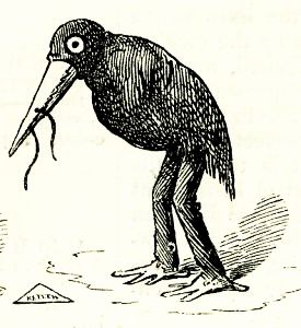 "This," said the young man from the city, "is the celebrated adjutant bird of the East Indies. This bird is to be seen familiarly walking about the streets of Calcutta, where he is, in fact, the Street-cleaning Bureau, Board of Health, and Captain Williams all combined. There are no ash barrels there, no garbage carts, no nothing; he gobbles up everything himself. He will swallow a leg of mutton at one gulp, and as for tomato cans, they are like strawberries to him. He can impale a man on his strong bill, and has done it before now—"