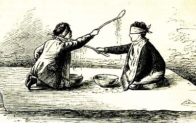 We had lots of fun that night. I can not pretend to tell you all we did; but one or two things I must describe, because they are worth doing again. A sheet was procured from the daughter, and spread on the floor. Each of the two boy cousins was blindfolded, and had an apron tied around his neck like a bib; then each was provided with a long wooden spoon and a bowl of bran, and they were placed opposite each other, as represented in our picture, and told to feed each other with the bran, encouraged by the promise that if they each succeeded in getting a mouthful of the bran, they should receive a very large piece of cake by way of reward. The struggles of these two boys were funny to the last degree. We all laughed and laughed till our sides ached again.