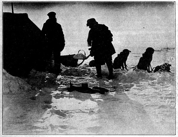 A Hudson's Bay Company's Post Inspector camping for the night near Great Slave Lake. Defying the snows, these hardy men "mush" with dog teams from Fort to Fort across the vast silent spaces of the great North, keeping H.B.C. communications open and taking account of furs traded at each post of the district.