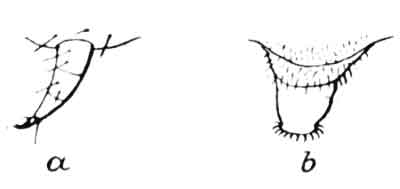 Turning again to the "feet" of the caterpillar, it will be seen [Pg 4]from the figure that the true legs (a) differ from the false legs (b) in structure. The former are horny, jointed, and have terminal claws; the latter are fleshy, with sliding joints, and the foot is furnished with a series of minute hooks which enable the caterpillar to obtain a secure hold when feeding, etc. The false legs are also the chief means of locomotion, as the true legs are of little service for this purpose. The true legs, however, appear to be of use when the caterpillar is feeding, as the leaf is held between them so as to keep it steady whilst the jaws are doing their work.