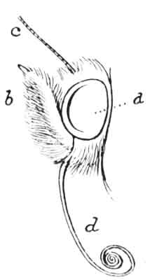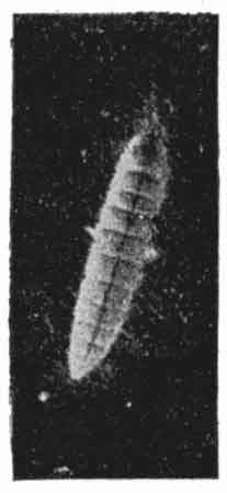 All the various parts referred to, or to be presently mentioned, may be seen in Fig. 1, which also shows a peculiarity that is [Pg 3]found in very young caterpillars of the Orange-tip, and in some others of the "Whites" (Pieridæ). The odd thing about this baby caterpillar is that the fine hair arising from each wart is forked at the tip (Fig. 1, a), and holds thereon a minute globule of fluid. When the caterpillars become about half grown these special hairs are lost in a general clothing of fine hair. Fig. 1, b, represents a magnified single ring of the caterpillar, and this shows a spiracle and the folds of the skin (subsegments). The manner in which such folding occurs is to be observed in the higher study of larval morphology.