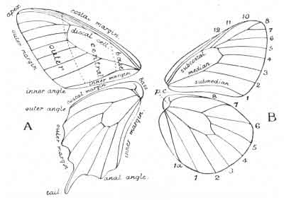Butterflies belong to the great Order of insects called Lepidoptera (Greek lepis, a scale, and pteron, a wing), that is, insects whose wings are covered with minute structures termed scales. Moths (Heterocera) also belong to the same order, and the first point to deal with is how may butterflies be distinguished from moths? In a broad kind of way they may be recognized by their horns (antennæ), which are slender as regards the shaft, but are gradually or abruptly clubbed at the extremity. For this reason they were designated Rhopalocera, or "club horned," the Heterocera being supposed to have horns of various kinds other than clubbed. As a matter of fact this method of separating moths and butterflies does not hold good in dealing with the Lepidoptera of the world, and it is from a study of these, as a whole, that systematists have arrived at the conclusion that there is no actual line of division between moths and butterflies. In modern classification, then, butterflies are reduced from the rank of a sub-order, which they formerly held, and are now dovetailed into the various newer systems of arrangement between certain families of moths.