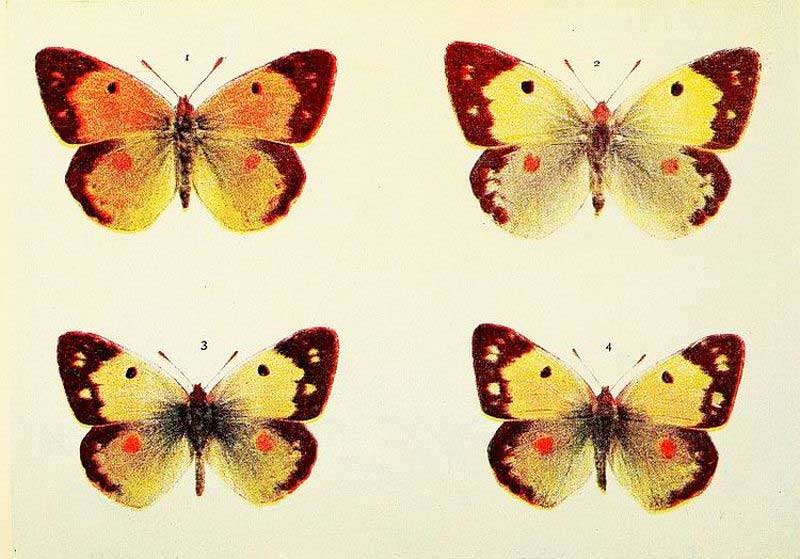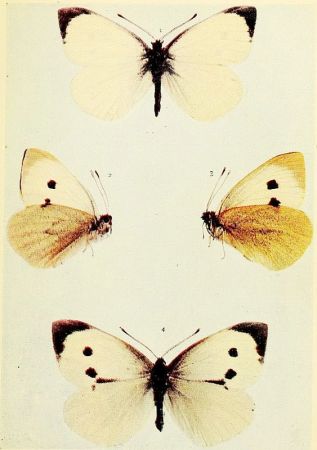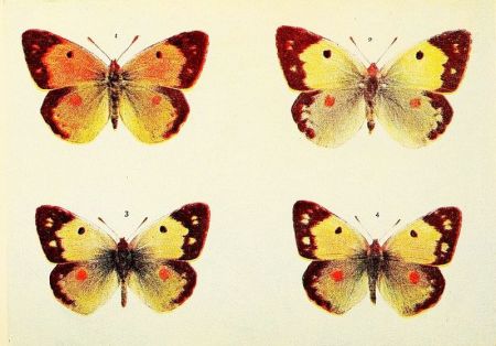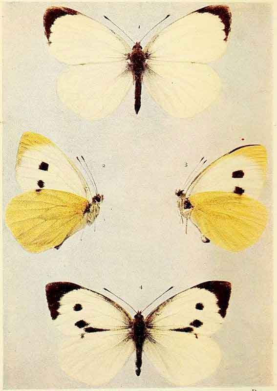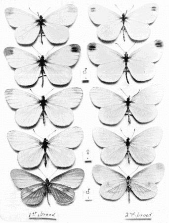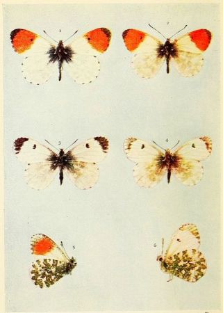 In those kinds of butterflies that attain the perfect state twice in the year, the individuals composing the first flight are somewhat different in marking from those of the second flight. Such species as the large and small whites exhibit this kind of variation, which is termed seasonal dimorphism. The males of some species, as for example the Common Blue and the Orange-tip, differ from the females in colour; this is known as sexual dimorphism. The Silver-Washed Fritillary, which has two forms of the female, one brown like the male, the other green or greenish in colour, is a good example of dimorphism confined to one sex. Gynandrous specimens, sometimes called "Hermaphrodites," are those which exhibit both male and female coloration, or other wing characters; when one side is entirely male and the other side entirely female, the gynandromorphism would be described as complete.