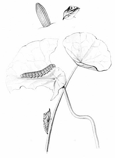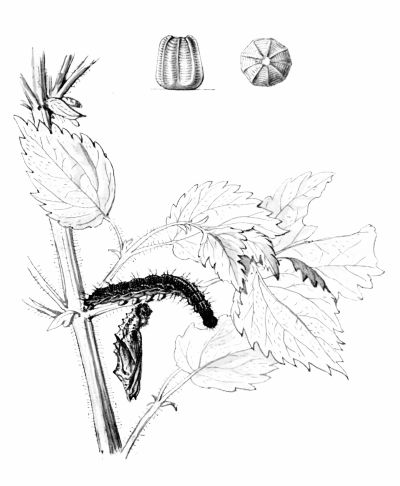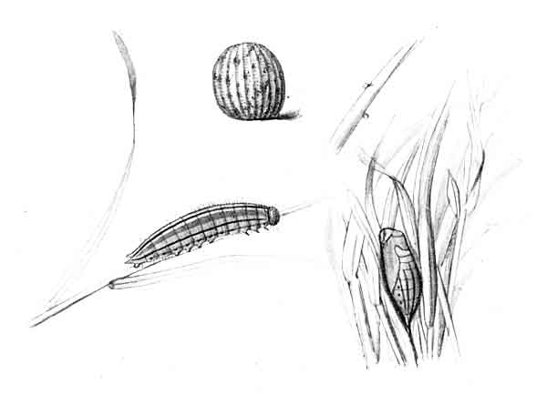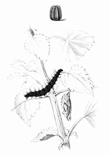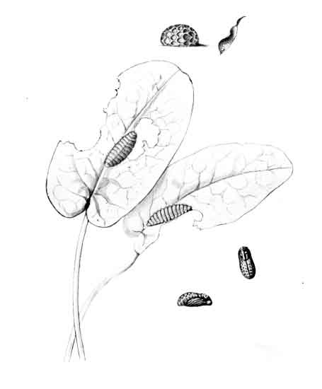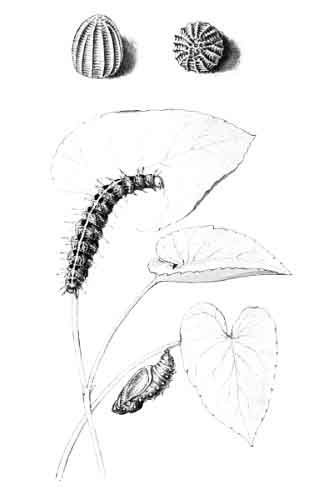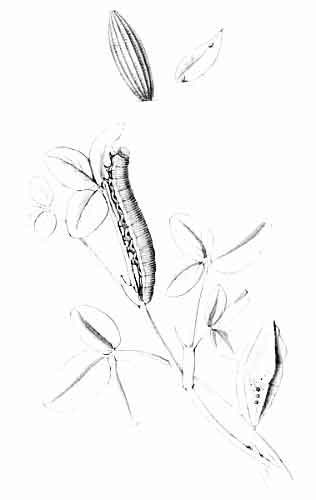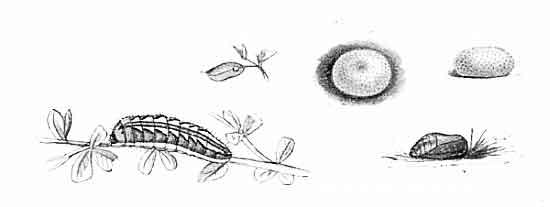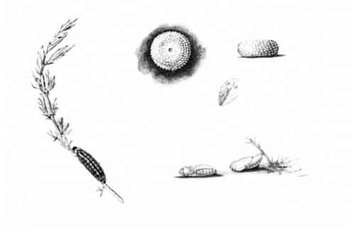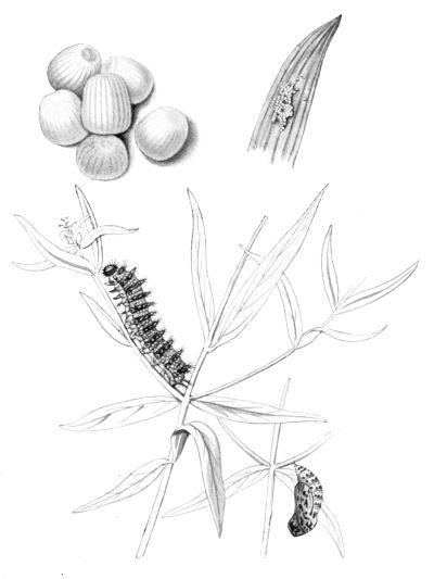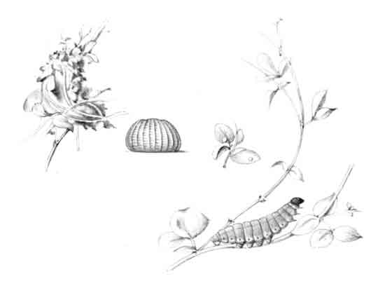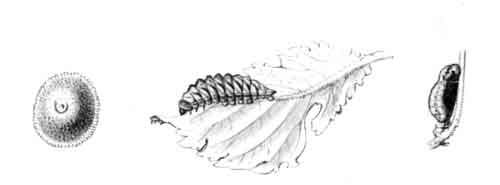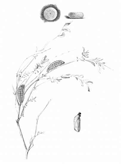 The egg "is of a long oval figure, half as long again as wide, the shell glistening, devoid of ribs or reticulation; at first white, then turning dull yellowish, and at last paler again, with the [Pg 188]dark head of the caterpillar showing through. The young caterpillar eats part of the empty egg-shell."