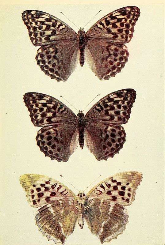 The ornamentation on the under side of a butterfly differs from that of the upper side, and is found to assimilate or [Pg ix]harmonize in a remarkable manner with the usual resting-place. It is therefore of service to the insect when settled with wings erect over the back, in the manner of all butterflies, except some few kinds of Skippers.