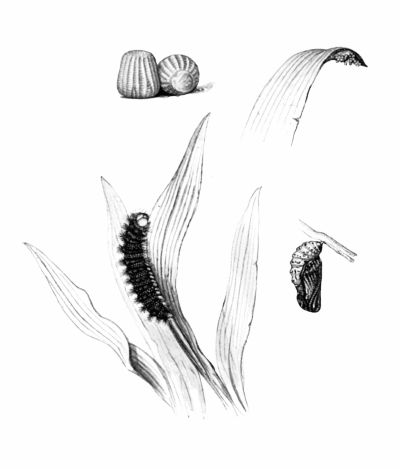 The egg-laying of this butterfly has been observed by Mr. Ullyett, who states that the female, having selected a suitable grass-stem, deposits eggs in a line in a sheath formed by the leaf round the stem. The caterpillars hibernate in tubes of grass, and feed up in the spring.