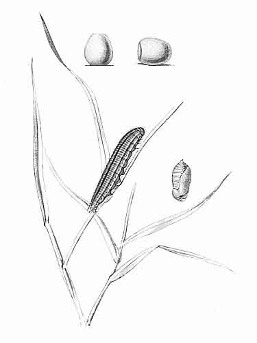 Buckler, referring to four caterpillars found on Brachypodium sylvaticum, June 11, states that they completed their growth on a diet of Triticum repens. They ate out wedge-shaped portions from the sides of the grass blades, and when they had finished their repast, they crawled down to the middle of the blade, and there spun a coating of white silk from one side to the other, causing the two edges of the blade to draw together a little, and then in the silk-lined hollow they rested until hunger obliged them to ascend the blade again for another meal. About June 23 they had ceased to feed, and were beginning to fasten themselves within more closely constructed retreats, formed where two blades of grass obliquely crossed each other. The colour of the chrysalis is similar to that of the caterpillar, and the lines are faintly traceable. The butterflies appeared July 14 to 18, emerging at night, and ready for flight in the morning.