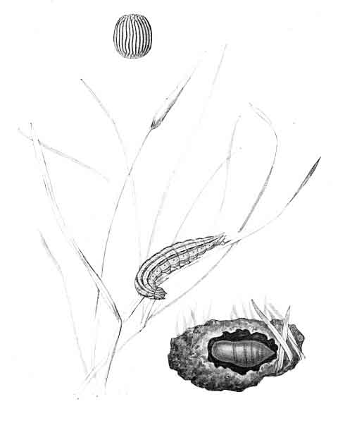 The egg (Plate 124) is pale greenish-yellow, oval in shape, flattened above and below; the top is slightly depressed. The eggs are deposited in July or August, in dried grass seed-heads and inside the sheath of a leaf, and the caterpillars, according to Hawes, do not hatch until April.