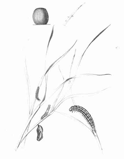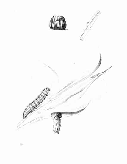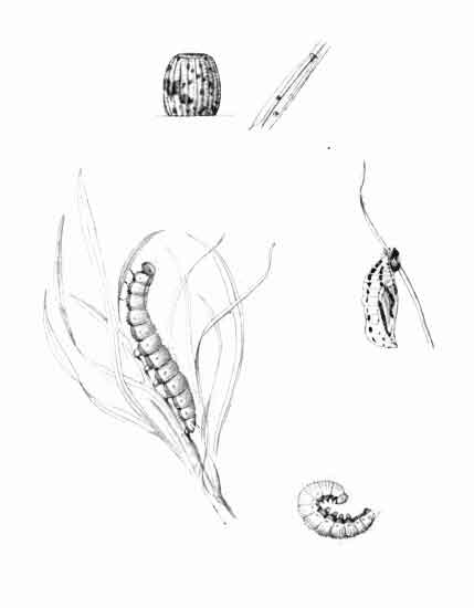 Living females received in June were placed on a growing plant of brome grass (Bromus asper), and a few eggs were deposited, some upon the blades of grass, others upon the gauze-covered glass jar in which the plant was placed; they were laid singly, firmly adhering to whatever laid upon. The first lot of eggs were deposited on June 14. The egg has a pearly appearance, being whitish or yellowish-white in colour. Ten days after the egg is deposited the young caterpillar emerges by eating away the crown. Soon after hatching out the young caterpillar makes a little tubular dwelling, drawing together the edges of the grass-blade by spinning about three or four stout cords of silk, which quickly contract, causing the edges to draw together, and sometimes to overlap, forming a compact short tube; generally before spinning it nibbles off the extreme edge of the blade where the silk is afterwards attached. It feeds upon the blade both above and below its abode, devouring so much that frequently only the midrib of the blade remains, and the tube only just long enough to conceal it; it then shifts its quarters, and prepares a new home.
