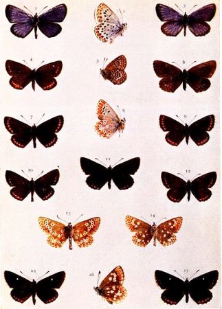 As regards British butterflies, however, it will be found that these may be known, as such, by their clubbed horns. Only the Burnets among British moths have horns in any way similar, and these are thickened gradually towards the extremity rather [Pg viii]than clubbed. Day-flying moths, especially the bright-coloured ones, might be mistaken for butterflies by the uninitiated, but in all these the horns will be found not at all butterfly-like.