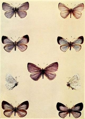 Butterfly eggs are of various forms, and whilst in some kinds the egg-shell (chorion) is elaborately ribbed or fluted, others are simply pitted or covered with a kind of network or reticulation; others, again, are almost or quite smooth. If the top of an egg, such as that of the Purple Emperor (Plate 28), is examined under a good lens a depression will be noted, and in this will be seen a neat and starlike kind of ornamentation. In the middle of this "rosette" are, present in all eggs, minute apertures known as micropyles (little doors), and it is through these that the spermatozoa of the male finds entry to the interior of the egg and fertilization is effected. The changes that occur in the egg after it is laid are of a very complex nature, and readers [Pg 2]who may desire information on this subject are referred to Sharp's "Insects," Part I., in the "Cambridge Natural History," where also will be found much interesting and instructive matter connected with the caterpillar and chrysalis, to which stages only brief reference can here be made.