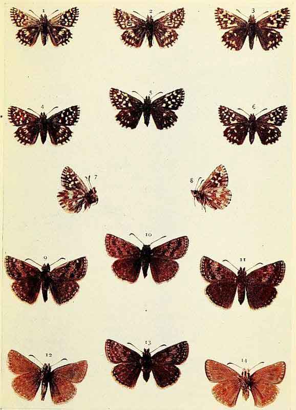 Grizzled Skipper. 1, 2, 7 male; 4, 5, 8 female; 3 var. male; 6 do. female.