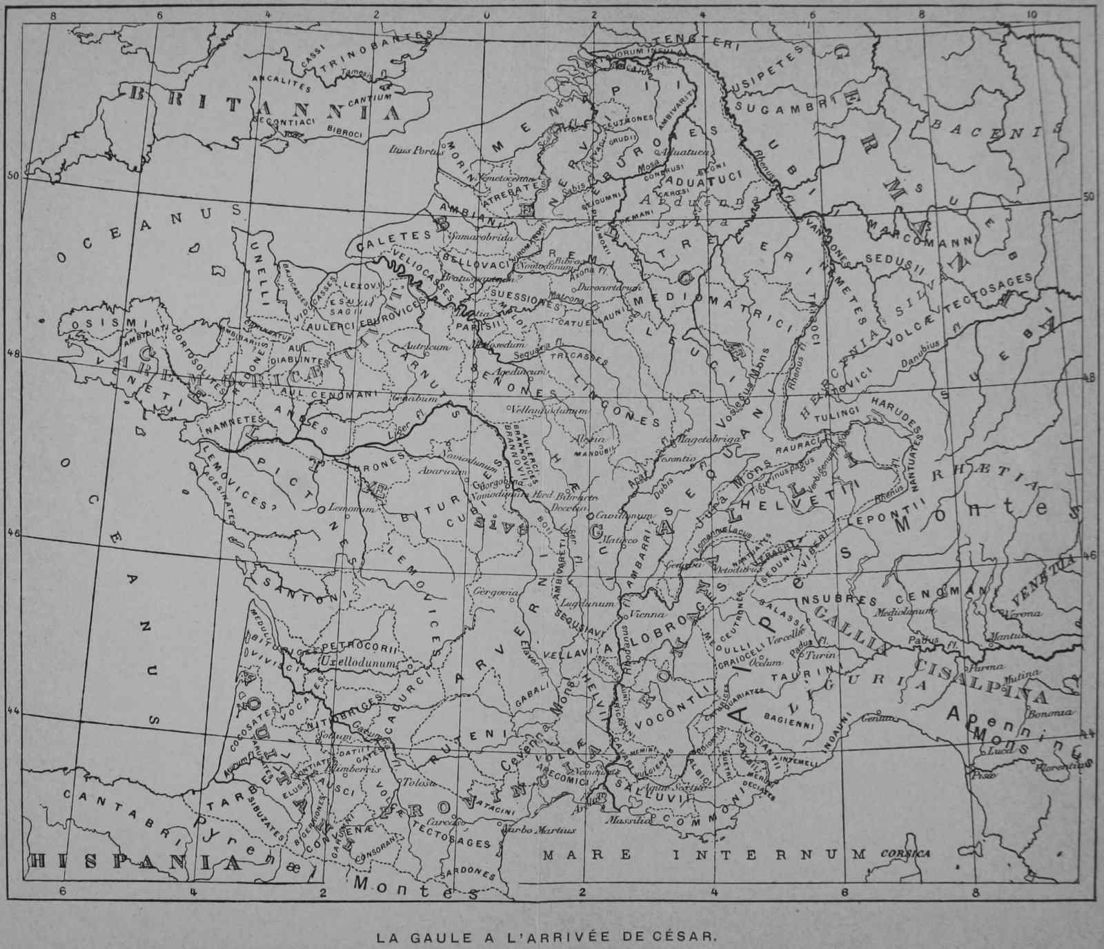 [176] La carte que nous reproduisons a été empruntée à l’excellente édition classique de César, par Benoist, Dosson et Lejay (4e tirage, 1899, Paris, Hachette): elle ne donne pas, sur certains points, la place, les noms ou les limites que nous assignons nous-mêmes aux peuples gaulois ou à leurs villes; mais ces points n’intéressent pas les principaux événements racontés dans ce livre.