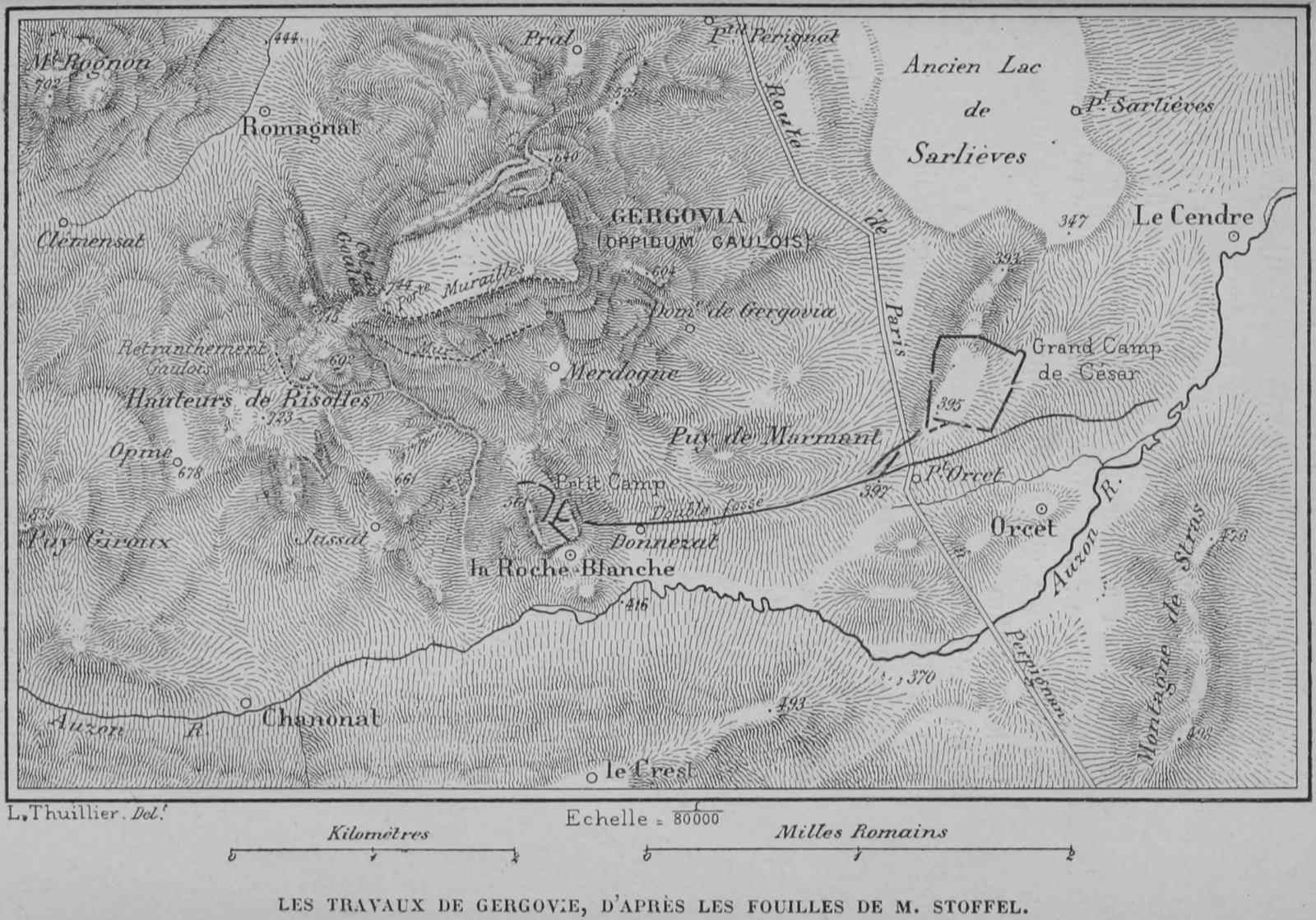 [60] En plaçant le grand camp à Gondole, le petit au Crest, et à Montrognon la colline fortifiée par Vercingétorix.