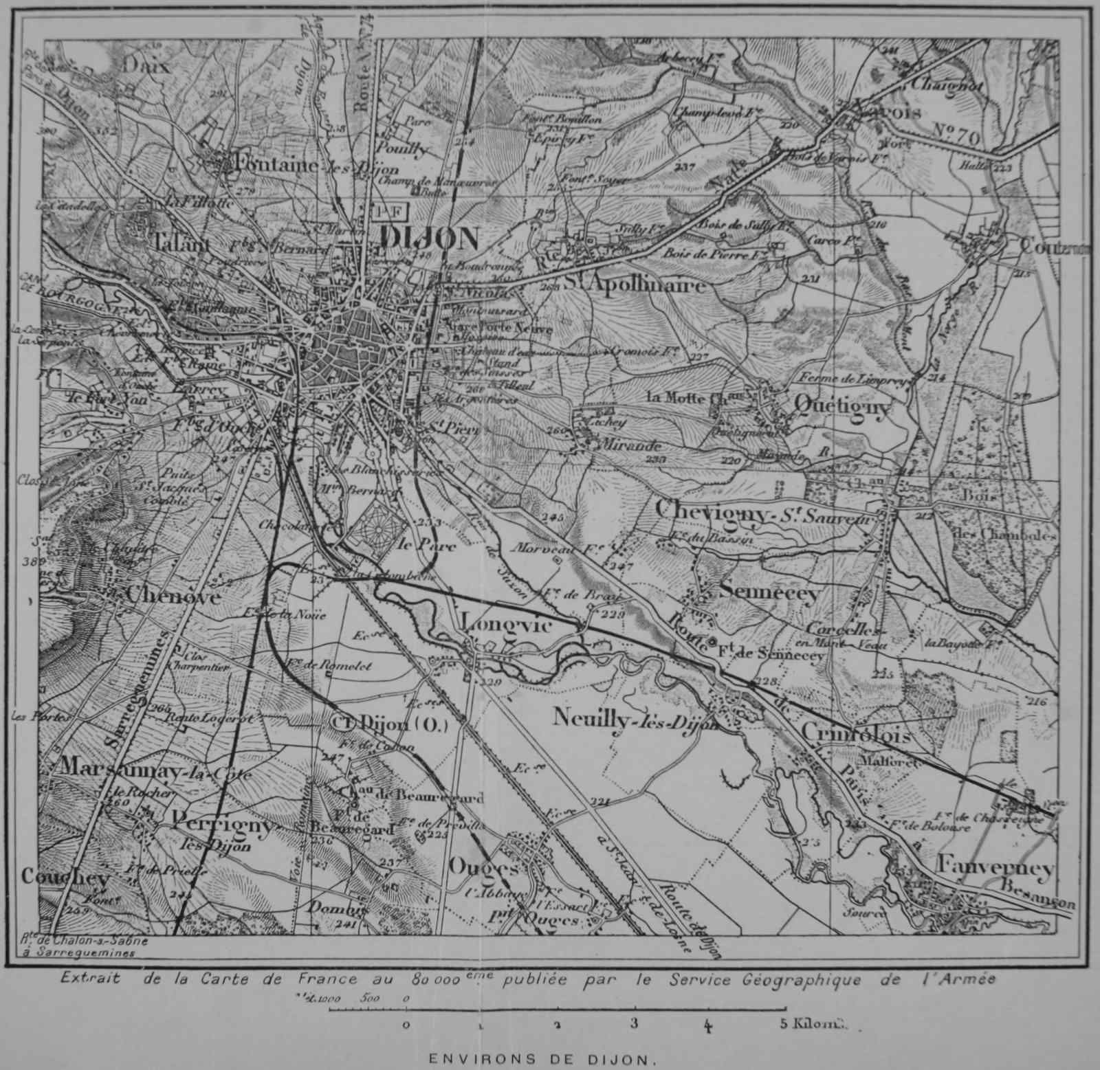 [110] Les trois camps de Vercingétorix (VII, 66, 3 et 5; 68, 1) peuvent être cherchés, sur la rive droite, sur les hauteurs entre le fort de Beauregard et le faubourg de l’Ouche.