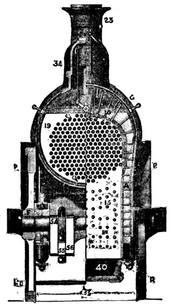 15, stays in walls of fire-boxes. 18, stays from crown plate to covering plate. 19, tubes. 23, smoke-stack. 40, ash-pan. 54, crank shaft. 55, big end of crank-shaft. 56, arm of big end. 34, dome.