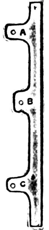 43, Frame plate from end to end of engine. 44, Iron buffer-beam. 46, Cylinders. 50, Horn block, to carry axle-box and brass. 51, Axle-box and brass. 52, Slide bars. 53, Connecting-rod. 54, Driving axle. 55, Big end of driving axle. 56, Arm of driving axle. 59, Valve-spindle. 60, Valve-rod guide. 61, Pump. 76, Hand brake. 85, Brake blocks. 88, Trailing axle. 89, Leading axle. 90, Piston rod. 91, Piston head, held on the rod by a brass nut. 92, Backway eccentric rod. 93, Frontway eccentric rod. 94, Eccentric Straps. 95, Eccentric sheaves. 96, Tire. 97, Lip on tire. 98, Brake irons. 99, Foot plating. 100, Transverse stay. A, Water space between inside and outside fire boxes. B, Slide-block with end of pump-ram screwed into the end. C, Link motion (see 57, inside view). D, Slide valve rod, working guide. H, Inside journal, showing how the axle is supported inside of frame plates. I, Cross-head, solid, with piston rod.