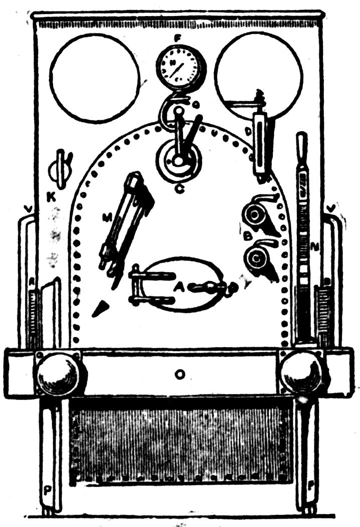 75, steam brake handle. 33, whistle handle. 23, smoke stack. K, K, weather glasses. O, speed indicator. E, conductor's bell. N, oil for cylinder. X, blower handle. R, right side of engine. L, left side of engine. M, M, gauge glasses.
