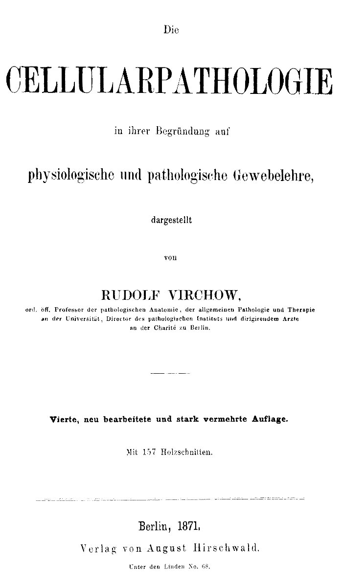 Die Vorlesungen, welche ich hiermit dem weiteren ärztlichen Publikum vorlege, wurden im Anfange dieses Jahres vor einem grösseren Kreise von Collegen, zumeist praktischen Aerzten Berlin's, in dem neuen pathologischen Institute der Universität gehalten. Sie verfolgten hauptsächlich den Zweck, im Anschlusse an eine möglichst ausgedehnte Reihe von mikroskopischen Demonstrationen eine zusammenhängende Erläuterung derjenigen Erfahrungen zu geben, auf welchen gegenwärtig nach meiner Auffassung die biologische Doctrin zu begründen und aus welchen auch die pathologische Theorie zu gestalten ist. Sie sollten insbesondere in einer mehr geordneten Weise, als dies bisher geschehen war, eine Anschauung von der cellularen Natur aller Lebensvorgänge, der physiologischen und pathologischen, der thierischen und pflanzlichen zu liefern versuchen, um gegenüber den einseitigen humoralen und neuristischen (solidaren) Neigungen, welche sich aus den Mythen des Alterthums bis in unsere Zeit fortgepflanzt haben, die Einheit des Lebens in allem Organischen wieder dem Bewusstsein näher zu bringen, und zugleich den ebenso einseitigen Deutungen einer grob mechanischen und chemischen Richtung die feinere Mechanik und Chemie der Zelle entgegen zu halten.