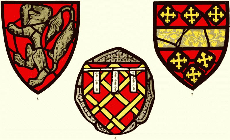 | II. | } | Shields in stained glass of the 14th century in the Victoria and Albert Museum. (From coloured drawings by Mr. T. W. Rutter) | 54 |