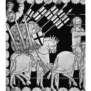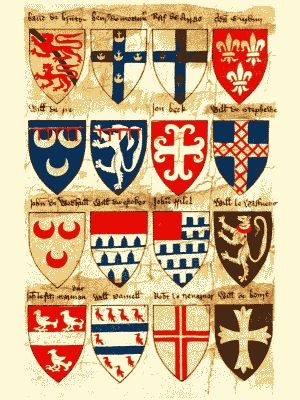 Any student, however, who has become interested in a single shield, or in the look of the thing as seen in a collection of fine examples of heraldry such as are illustrated in this volume, should be able to master the main principles in an hour or two. The curious terms are only old-fashioned; they are used, so far as they are necessary, not of malice, but because it is of the essence of heraldry that everything shall be so strictly defined that a few words may represent a shield of arms as surely as a picture. Hence everything has a name, everything is clear, sharp, and bright, the colours are few, the forms must be large and simple. Even the seemingly arbitrary dictum that 'no colour must be put on colour or metal on metal' may probably have arisen from the fact that when gilding or silvering was used on a shield it would form a perfect foil for[Pg 10] colours, but as they reflected light in the same way, they could not be distinguished if used one on the other. Even yellow pigment on white would not tell clearly at any distance; the maxim is merely a rule for the sake of distinctness. Again, the curious vigorous drawing of beasts and birds with the eyes staring and the feet spread out was not the result of a desire to be quaint, but arose naturally from the same need of being clear. A good naturalistic drawing of a lion would be useless on a flag. Granted the special needs of heraldry, it developed in a perfectly understandable way.