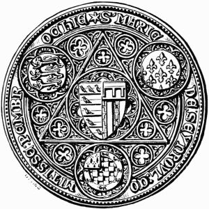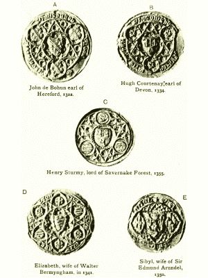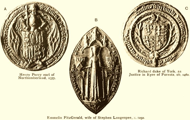 My thanks are due to the Society of Antiquaries of London for leave to reproduce the coloured illustrations in pls. I and II, for the loan of blocks or drawings of figs. 7, 13, 33, 64, 65, 101, 129, 153, 186, 187, 190, and 193, and for leave to photograph the[Pg 15] numerous casts of seals figured in pls. V-XIV and XVII-XXX and throughout the book; to the Royal Archæological Institute for loan of figs. 20 and 107; to the Sussex Archæological Society for the loan of fig. 142; to the Society of Arts for figs. 6, 15, 17, 28, 30, 41, 45, 46, 48, 51, 55, 73, 74, 86, 92, 114, 126, 127, 150, 154, 155, and 199; to the Royal Institute of British Architects for figs. 8, 93, and 199; to Messrs. Cassell & Co. for figs. 21, 53, 54, 56, 63, 81, 84, 85, 91, 108, 109, 117, 118, 124, 132, 133, 139, 151; to Messrs. Constable & Co. for figs. 9, 14, 43, 67, 68, 72, 75, 76, 77, 78, 83, 136, 137, 138; to Messrs. Parker & Co. for fig. 143; and to Messrs. Longmans & Co. for figs. 177, 183. Also to Mr. T. W. Rutter for lending the drawings reproduced in pls. II and III; to Mr. R. W. Paul for the drawing of fig. 184; to Mr. Mill Stephenson for the loan of the brass rubbings reproduced in figs. 19, 26, 27, 29, 31, 32, 35-39, 42, 146-148; to the Rev. T. W. Galpin, Mr. E. M. Beloe, and Mr. Aymer Vallance for the photographs of figs. 47, 149, and 191 respectively; and to the Rev. Severne Majendie for leave to photograph the effigies of the Duke and Duchess of Exeter (figs. 167, 168) in St. Katharine's chapel in Regent's Park.