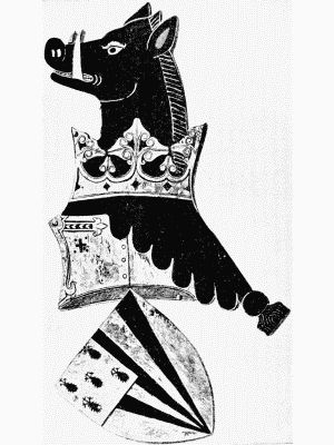 Arms with crested helm and badge of (apparently) Sir John Guldeford of Benenden, ob. 1565, in East Guldeford church, Sussex