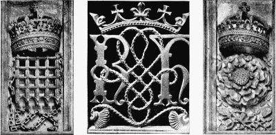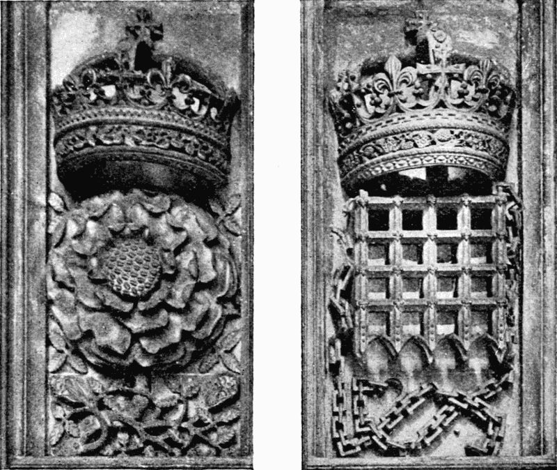 Crowned initials of King Henry VII from his chapel at Westminster, and crowned portcullis and rose from King's college chapel at Cambridge