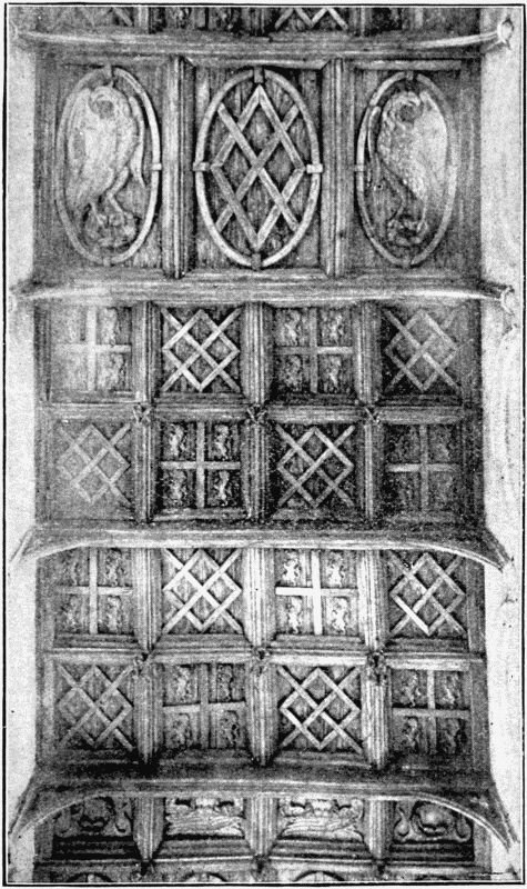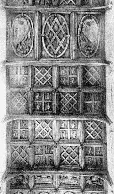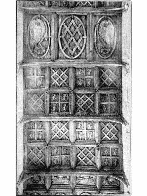 Fig. 199. Part of the carved oak ceiling of the chapel, formerly the hall, of Auckland castle, Durham, with the arms of bishop John Cosin, date 1662-4.