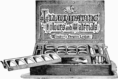 Cake Colours, Moist Colours in Glass Pots. Gold and Silver Shells, Saucers and Tablets, Gold Paper, Vellums, Brushes, and all requisites for the Art
