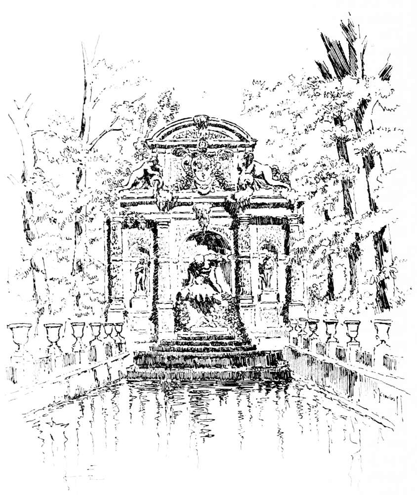 [146] It extended as far as the entrance to the quadrangle opposite the Pont des Arts. A double line of trees, north and south, enclosed a Renaissance garden of elaborate design, and a charming bosquet, or wood, filled the eastern extremity.