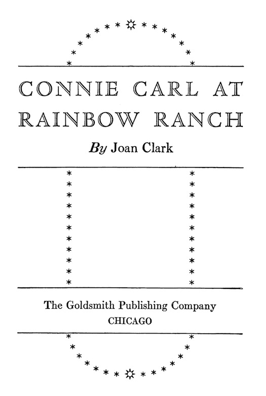 At first glance a stranger never would have taken Connie Carl for a Westerner. The girl was neatly dressed in a blue suit with gray suede slippers, and a wisp of auburn-red hair peeped from beneath her jaunty felt hat. She looked for all the world like a young lady who had just graduated from a stylish Eastern finishing school, which in truth, she had. But now, at sixteen, Connie Carl had returned to the prairie land she loved, to make her home once more at the place of her birth, Rainbow Ranch.
