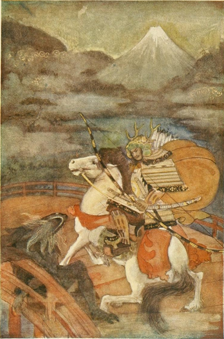 Benkei is one of the most lovable of Japanese heroes. He possessed the strength of many men, his tact amounted to genius, his sense of humour was strongly[Pg xvii] developed, and the most loving of Japanese mothers could not have shown more gentleness when his master's wife gave birth to a child. When Yoshitsune and Benkei, at the head of the Minamoto host, had finally vanquished the Taira at the sea-fight of Dan-no-ura, their success awakened the jealousy of the Shōgun, and the two great warriors were forced to fly the country. We follow them across the sea, over mountains, outwitting again and again their numerous enemies. At Matsue a great army was sent out against these unfortunate warriors. Camp-fires stretched in a glittering line about the last resting-place of Yoshitsune and Benkei. In an apartment were Yoshitsune with his wife and little child. Death stood in the room, too, and it was better that Death should come at the order of Yoshitsune than at the command of the enemy without the gate. His child was killed by an attendant, and, holding his beloved wife's head under his left arm, he plunged his sword deep into her throat. Having accomplished these things, Yoshitsune committed hara-kiri. Benkei, however, faced the enemy. He stood with his great legs apart, his back pressed against a rock. When the dawn came he was still standing with his legs apart, a thousand arrows in that brave body of his. Benkei was dead, but his was a death too strong to fall. The sun shone on a man who was a true hero, who had ever made good his words: "Where my lord goes, to victory or to death, I shall follow him."