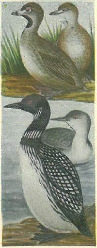 The smallest of the Loon family. The back and head are gray, there is a large patch of chestnut on the fore-neck; under parts white. Owing to the straight top to the upper mandible the bill has a slightly up-turned appearance.