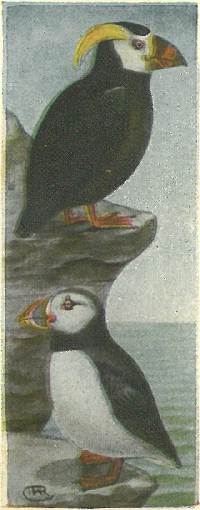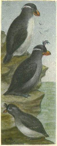 These birds have a much smaller bill than the Puffins; in the summer plumage there is a small horn at the base of the bill from which it is given its name. These birds do not stand upright as do the Puffins; but sit upon their tarsus.