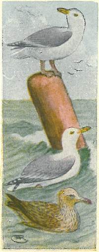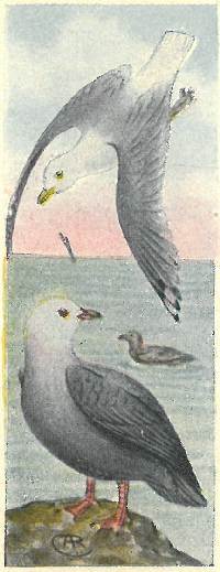 This large gull, with its almost pure white head and neck and slaty colored back, is one of the prettiest. They often nest in colonies with other gulls, building their small mounds of seaweed on the higher parts of the islands.